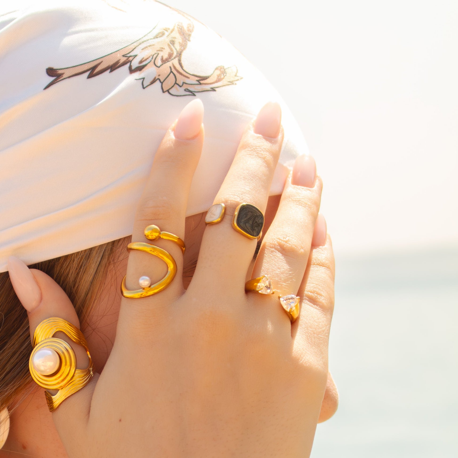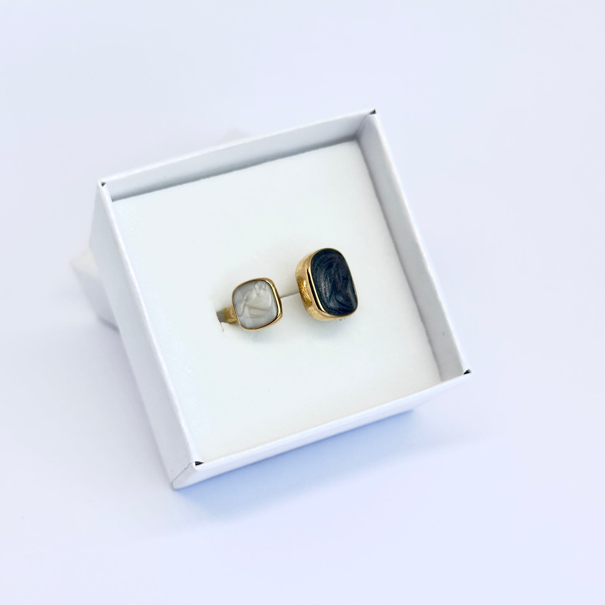 Elevate your look with this stunning black and white gemstone open Apex ring. Crafted from high-quality gold-plated stainless steel, it features a captivating contrast between a deep black stone and a luminous white gem. Hypoallergenic, tarnish-resistant, and designed to last, it’s the perfect accessory for both everyday wear and special occasions.