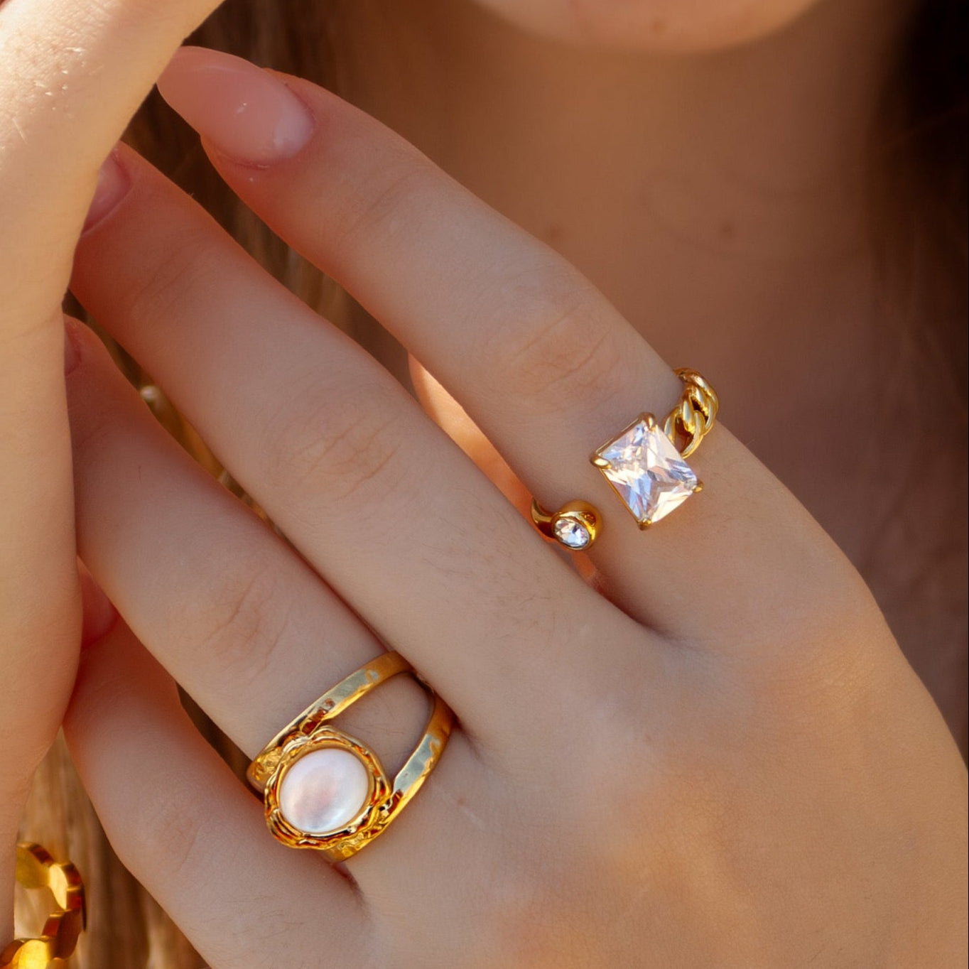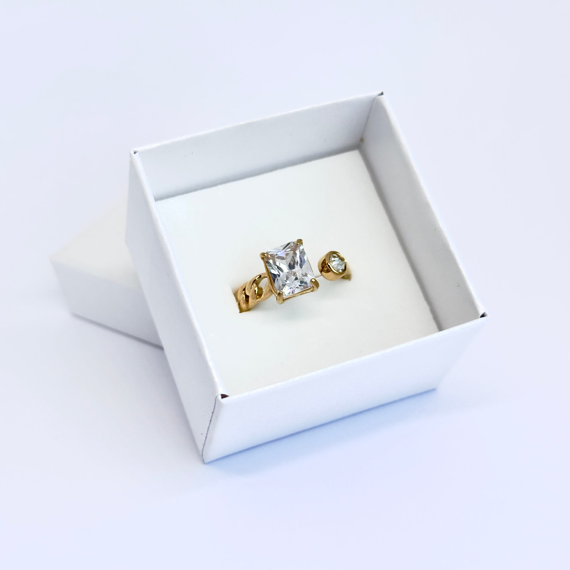 A timeless piece that exudes grace and sophistication. The Aurora Ring is designed to elevate any look with its delicate chain detail and luminous golden finish. Perfectly balanced between bold and refined, this ring is a statement of elegance that never fades.