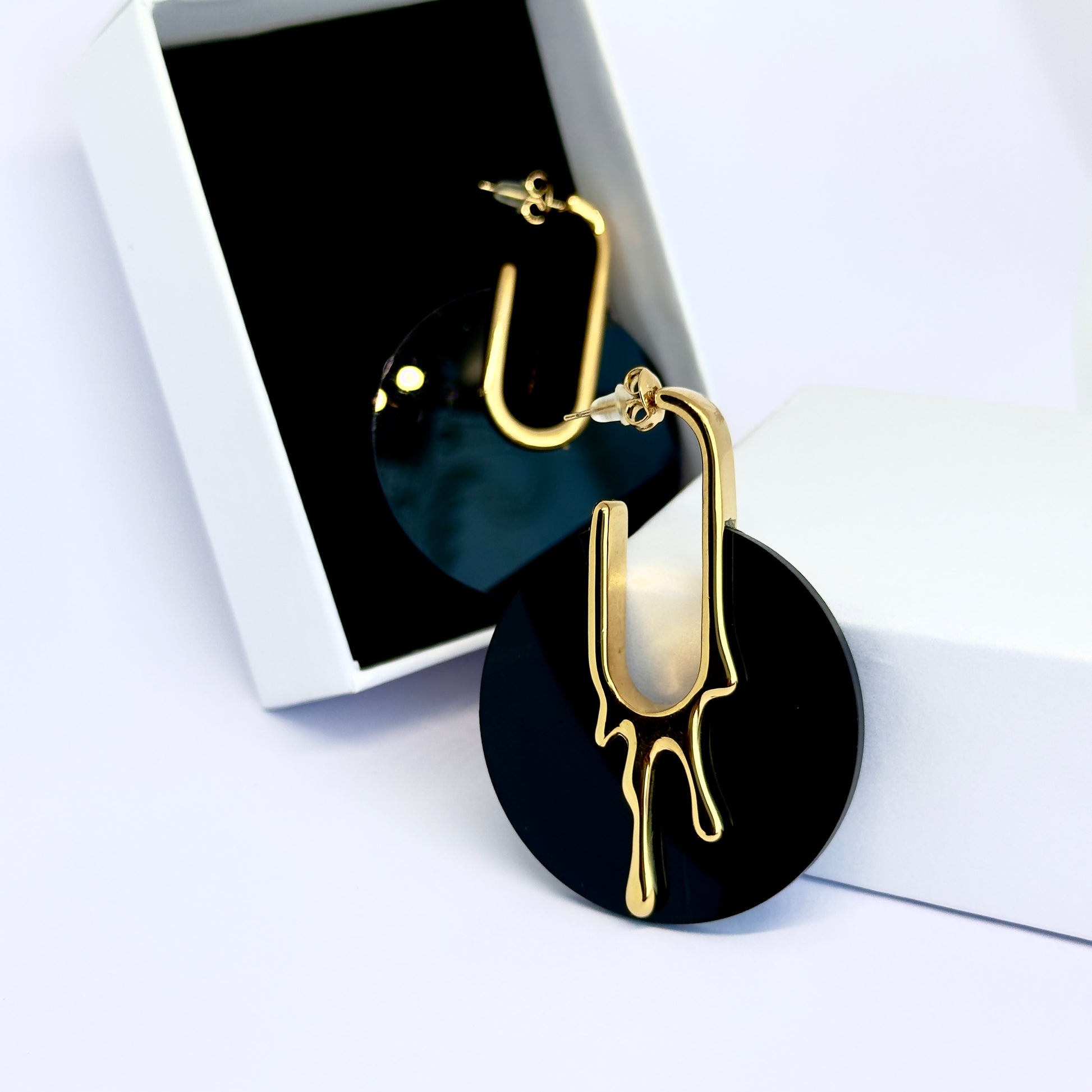 Bold and captivating, these statement Melted Black earrings combine sleek black discs with molten gold accents, creating a modern art-inspired masterpiece for your ears.