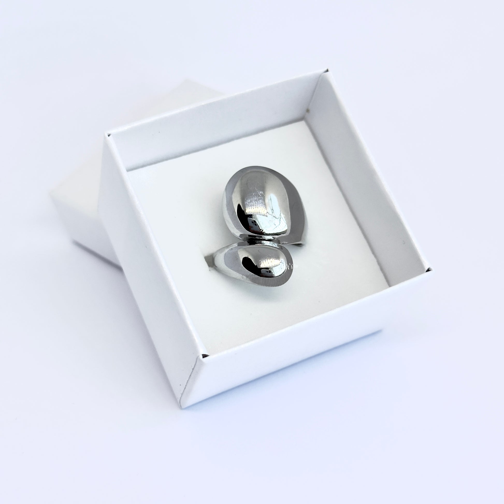 Sleek, bold, and effortlessly modern. The Mina Ring features two asymmetrical domes in polished silver that reflect light with every movement. A sculptural statement piece designed for those who embrace contemporary elegance with confidence and style.