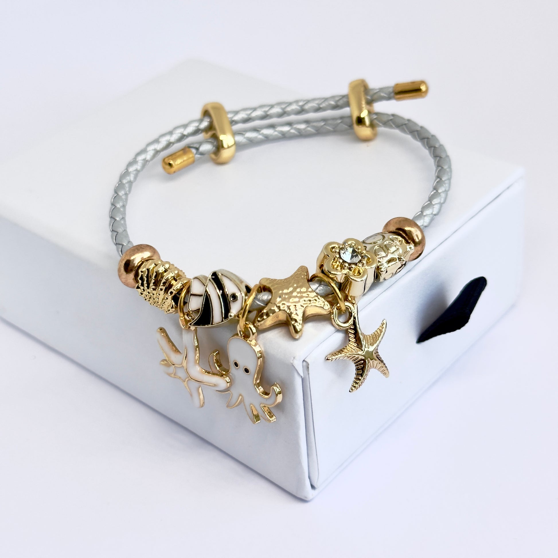 Bring the beauty of the sea to your wrist with this elegant charm bracelet. Featuring a mix of golden and enamel charms including a starfish, octopus, seashell, and tropical fish, it perfectly captures a playful marine spirit. The braided leather strap adds a modern touch, while the detailed charms add sophistication and personality.