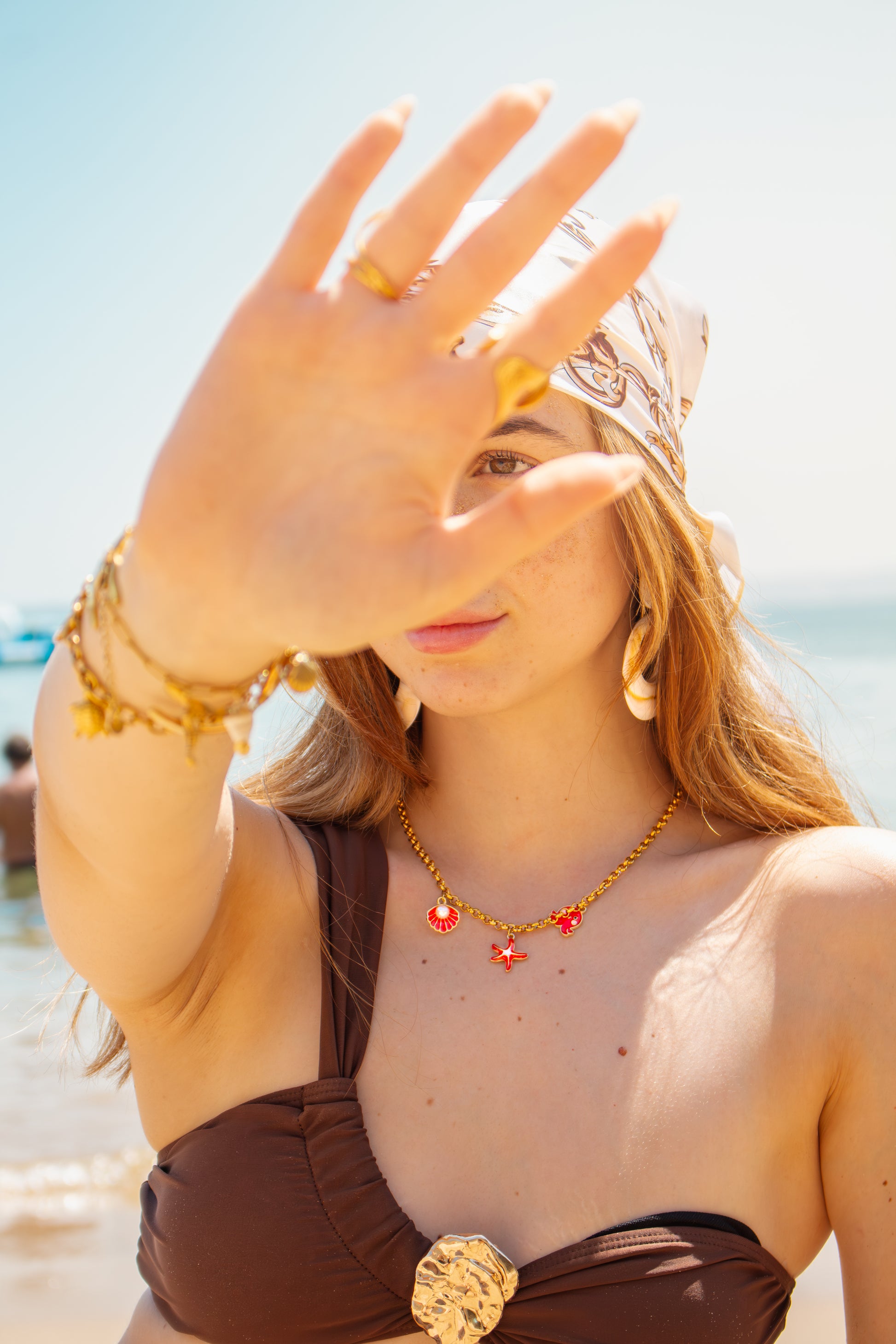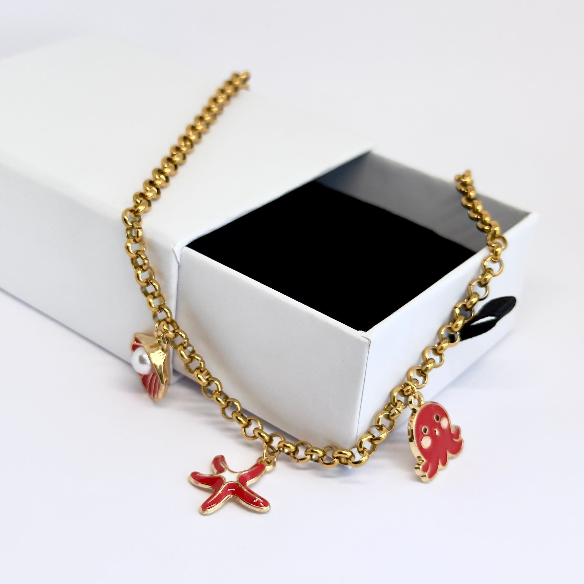 Bring the ocean with you wherever you go. This golden necklace features three charming pendants: a starfish, a seashell with a pearl, and a cute little octopus – all in vibrant red enamel. Crafted in gold-tone stainless steel, it's the perfect accessory for beach days, summer looks, or adding a splash of joy to your everyday style.