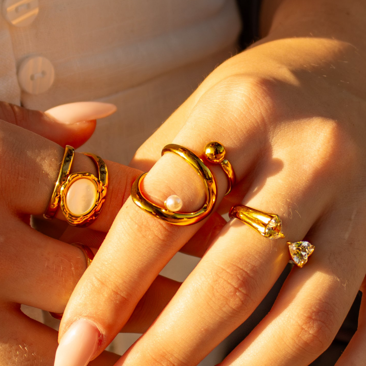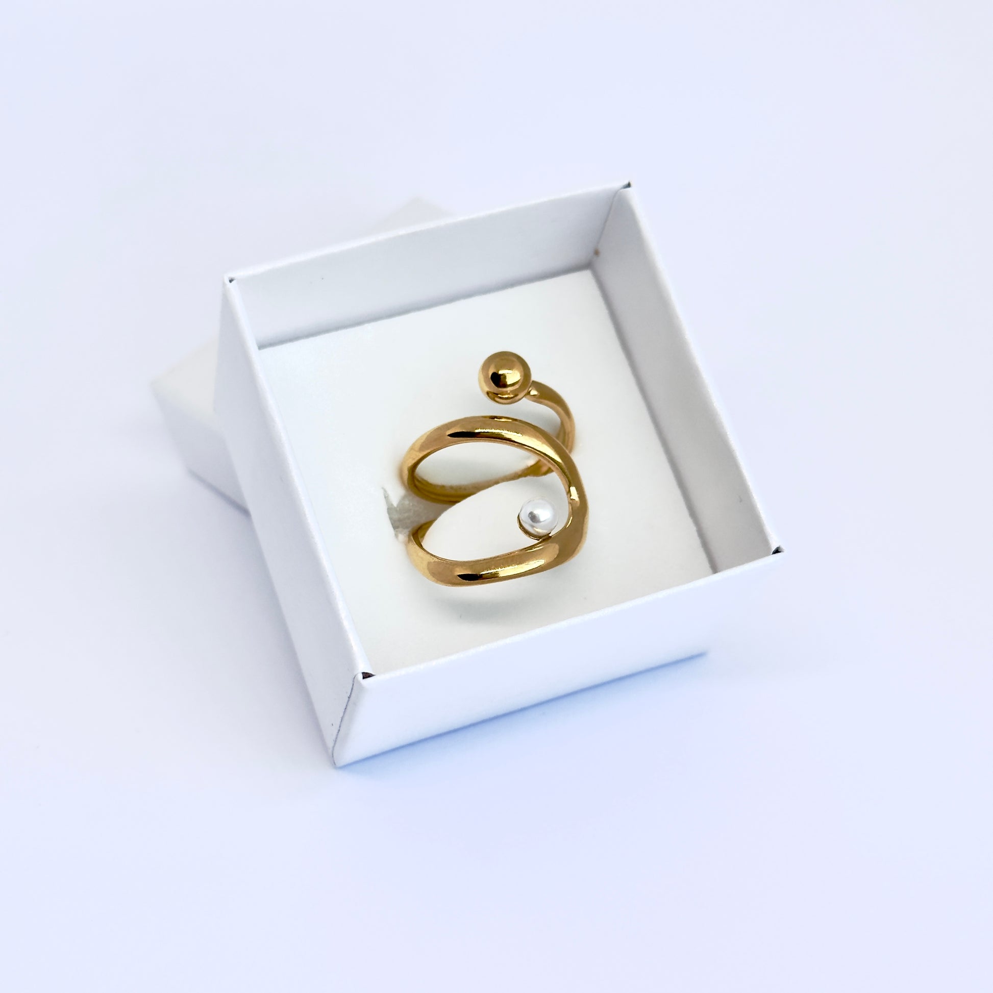 With its fluid curves and modern elegance, the Siren Ring captures the allure of ocean waves. Crafted in polished stainless steel, it features two contrasting orbs one pearl-inspired, one golden delicately balanced in a graceful open design. A statement of harmony, beauty, and bold femininity.